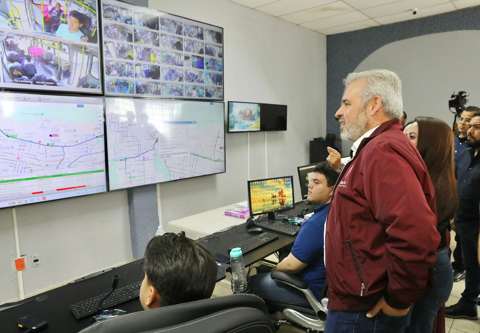 Durante una visita a los centros de monitoreo, el gobernador Alfredo Ramírez Bedolla, acompañado por la secretaria de Desarrollo Urbano y Movilidad, Gladyz Butanda Macías, y el secretario de Seguridad Pública, Antonio Cruz Medina, comprobó en tiempo real cómo se da seguimiento a 200 unidades pertenecientes a las cooperativas Tata Lázaro y Colectivos de Uruapan.